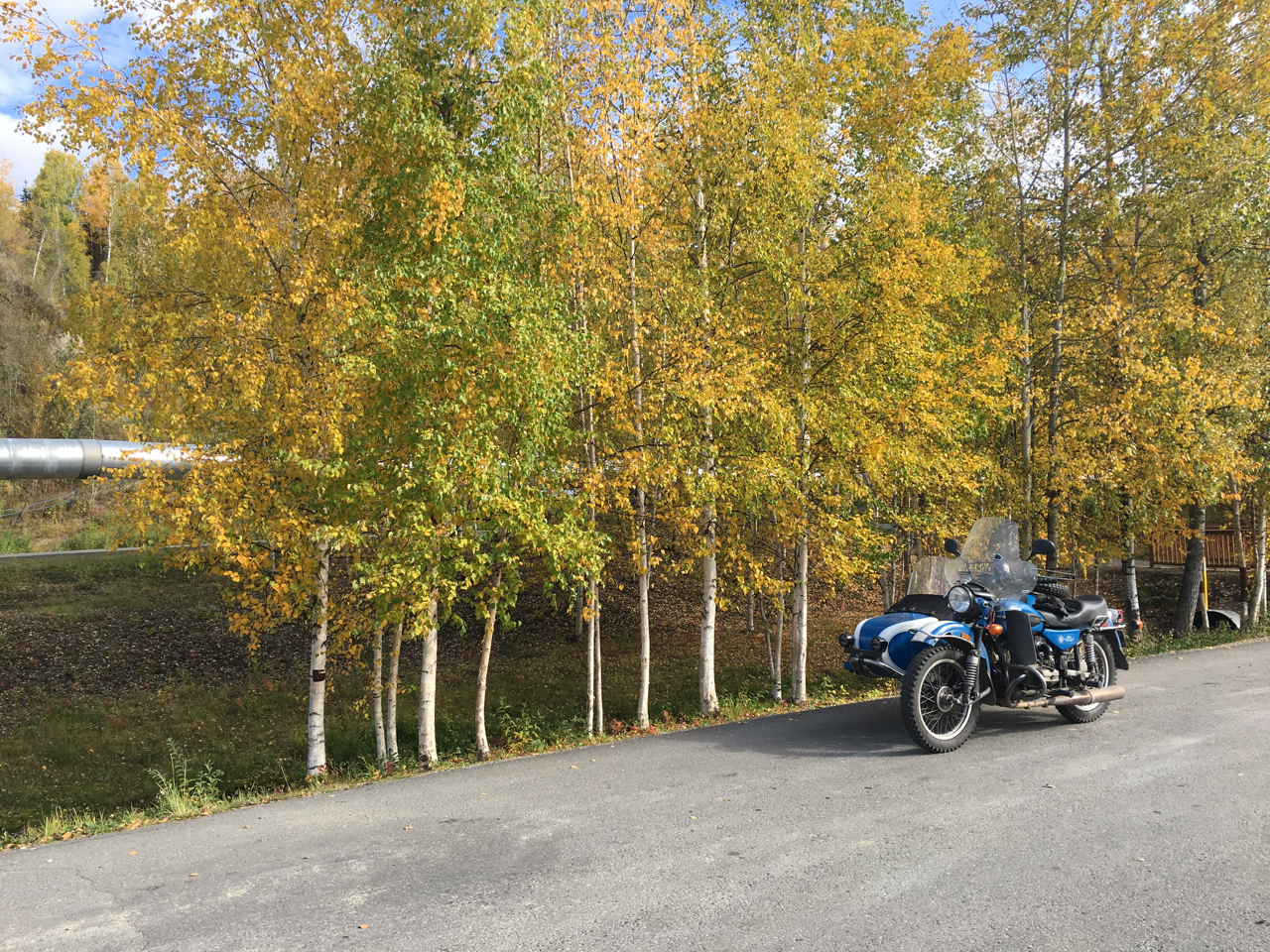 I then continued east towards the pipeline turnout on the Steese Highway. I thought that the trees would be more yellow. Maybe in a couple more days. I was reminded by a whining/spinning noise that I probably need to replace the bearings in the alternator drive. It's a pretty simple procedure and I believe that the bearings are available at Napa. I had helped JedR replace the bearings on his newer Ural. I think that they are pretty similar.