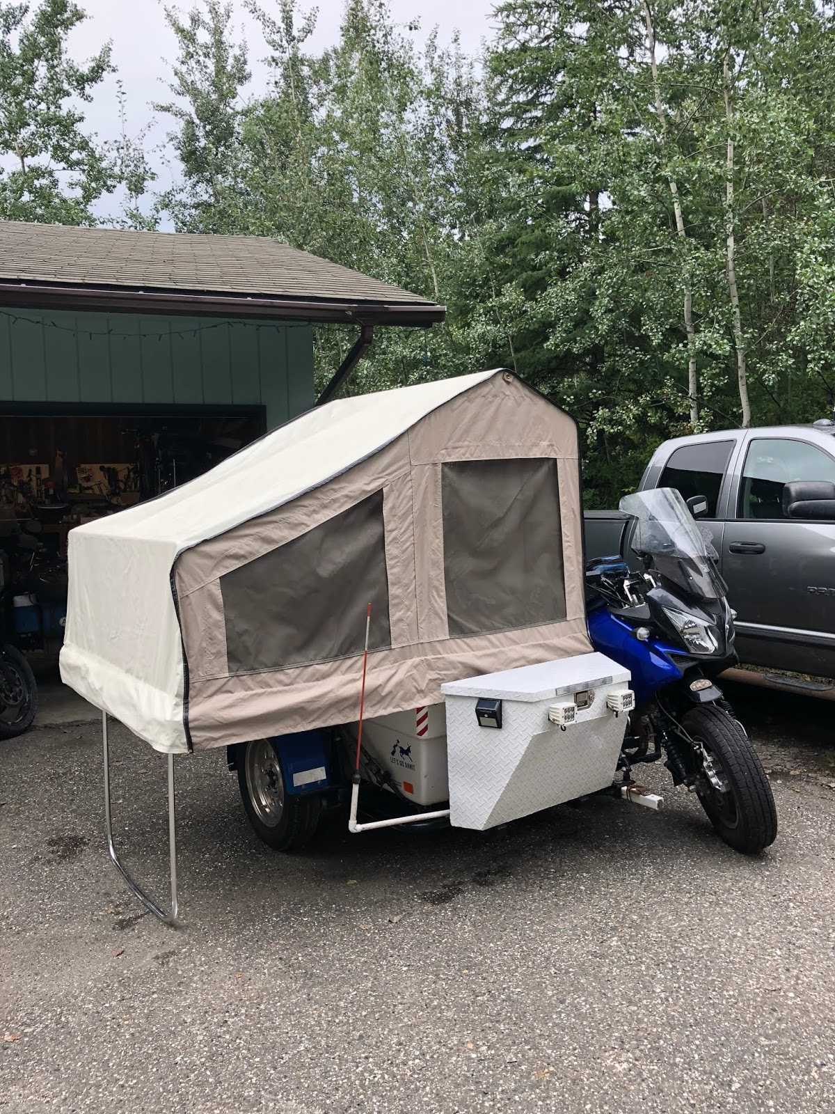 Anyone who has tent camped while on motorcycle trips will really appreciate the attraction of this rig. Lots of dry storage and not sleeping on the ground. During the setup, I noticed that the anti-sway bar arm was touching the sidecar frame. And the suspension piece that determined the ride height of the sidecar frame was set to its lower limit. I.e. there was no upward suspension travel at all on the sidecar. We made a small adjustment the next morning and he will see if it upsets the handling. I expect that the pull to the right will be reduced and the sidecar to tug attachment will need to be raised as well. That would eliminate the slight lean in i.e. the bike looked like it was leaning towards the tent trailer. But, then again, I have no experience with rigs running car tires.